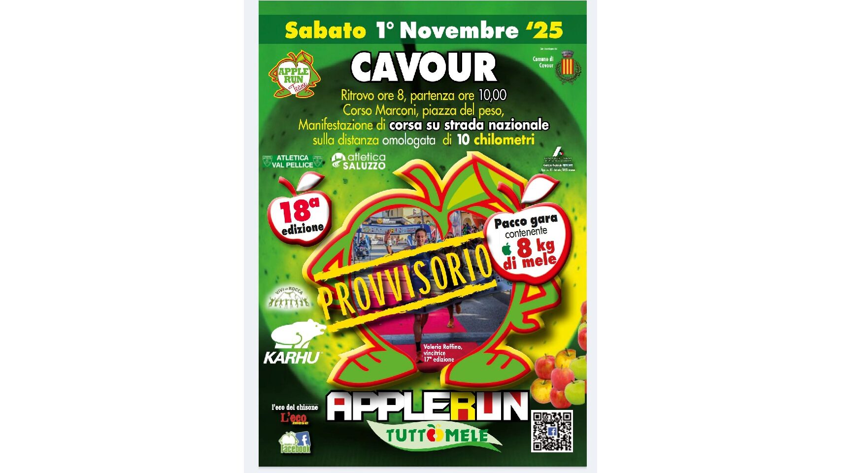 18ª edizione della Apple Run, in programma sabato 1° novembre 2025 a Cavour, su un percorso di 10 km omologati Fidal.